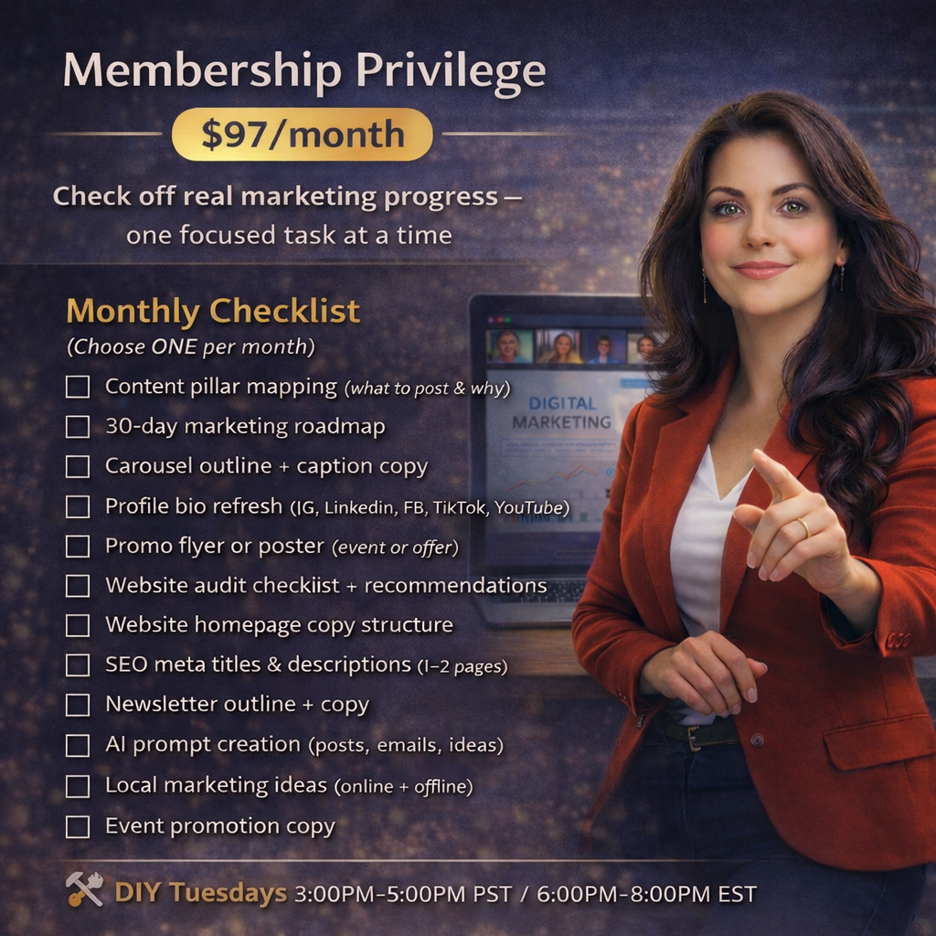 A weekly working session for business owners who want marketing progress — not pressure.