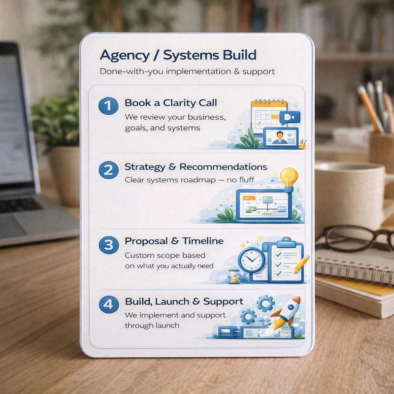 From planning to launch, we build the systems, guide implementation, and support you as everything goes live — so you’re never left guessing what comes next.